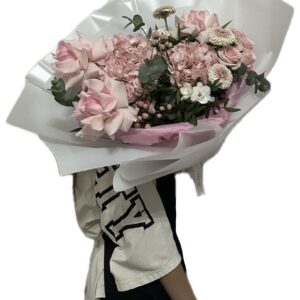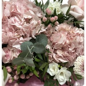 Acest produs contine: hortensii, trandafiri, frezii, hypericum, pomponii, mini roze  si verdeata.