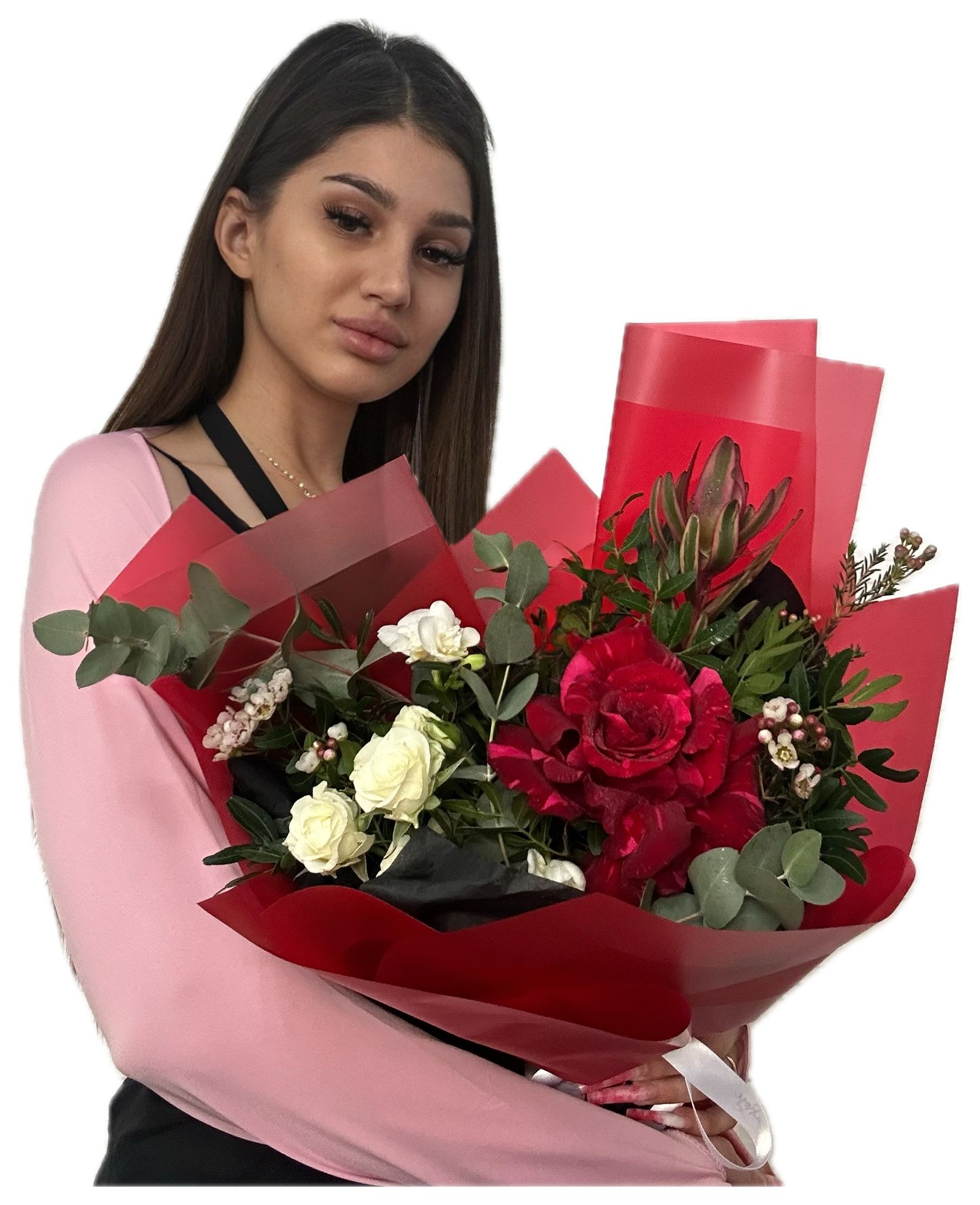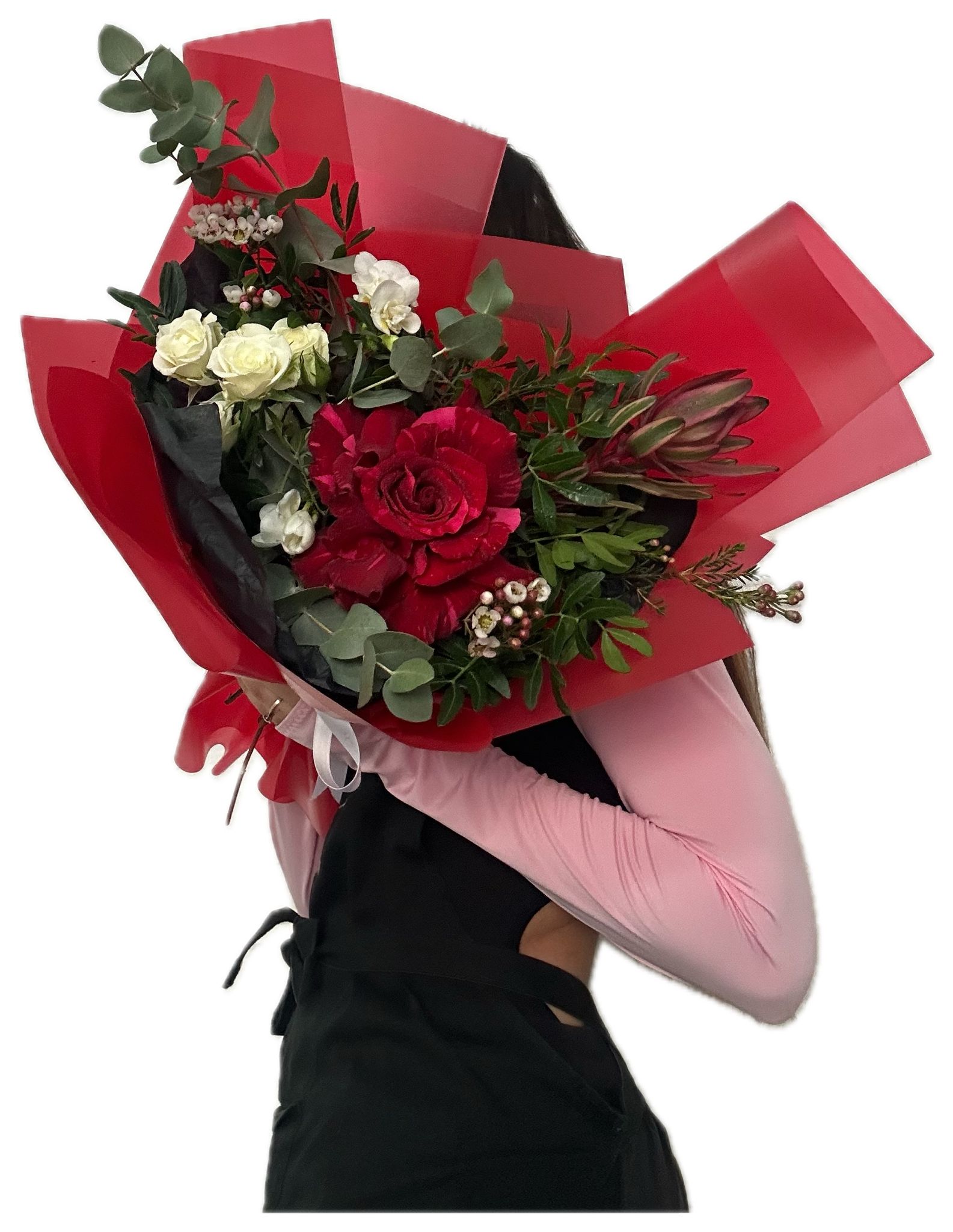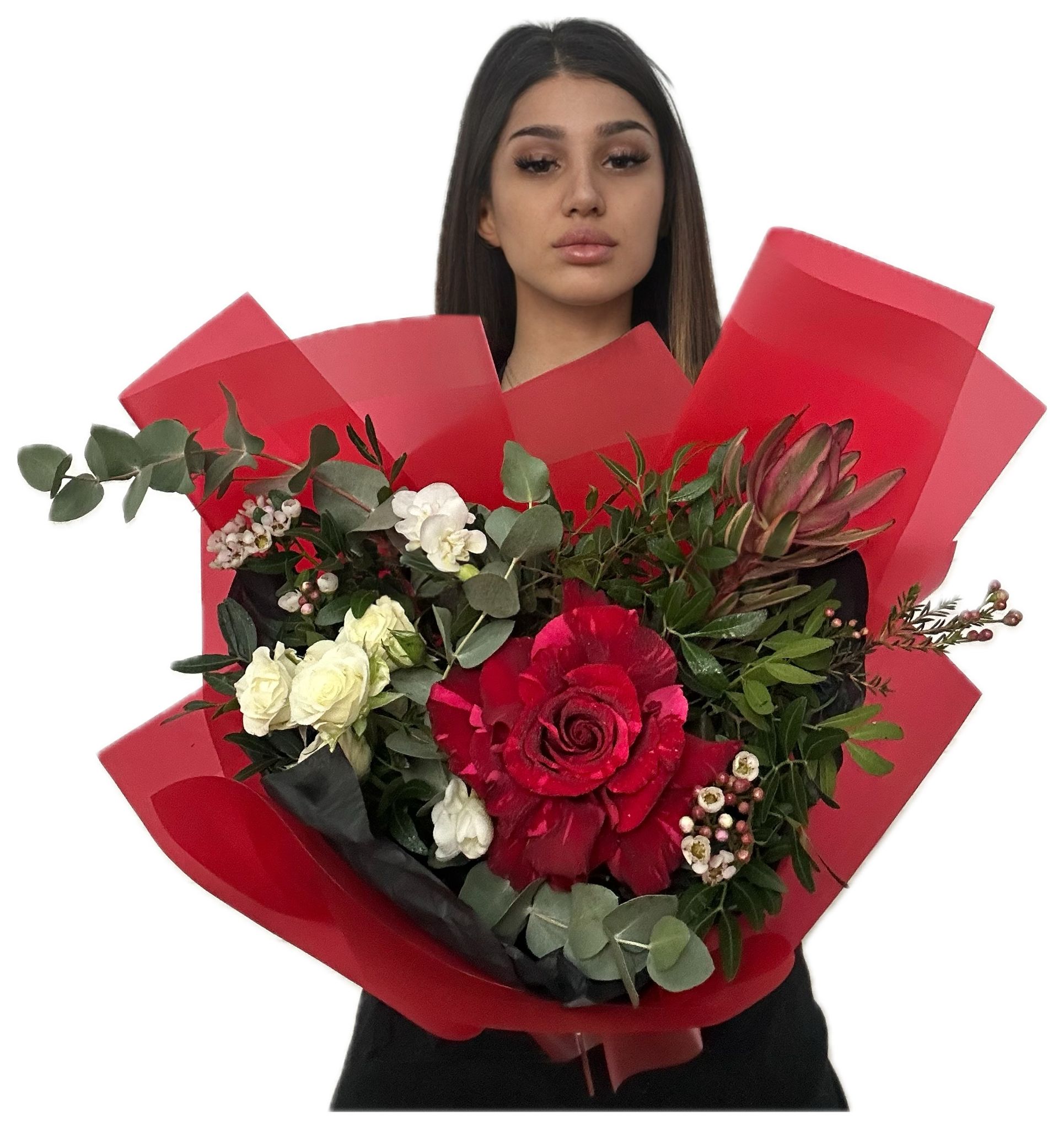 Creează momente de neuitat cu buchetul nostru special! Trandafirii roșii pasionali dansează alături de freziile albe pure, o mini-roză albă adaugă o notă de delicatețe, iar leucadendronul aduce un strop de textură și eleganță. Un amestec perfect de culoare și parfum, ideal pentru a celebra dragostea, admirația sau pur și simplu pentru a oferi o bucurie neașteptată. Fiecare floare este aleasă cu grijă pentru a compune o operă de artă florală, menită să impresioneze și să emoționeze.