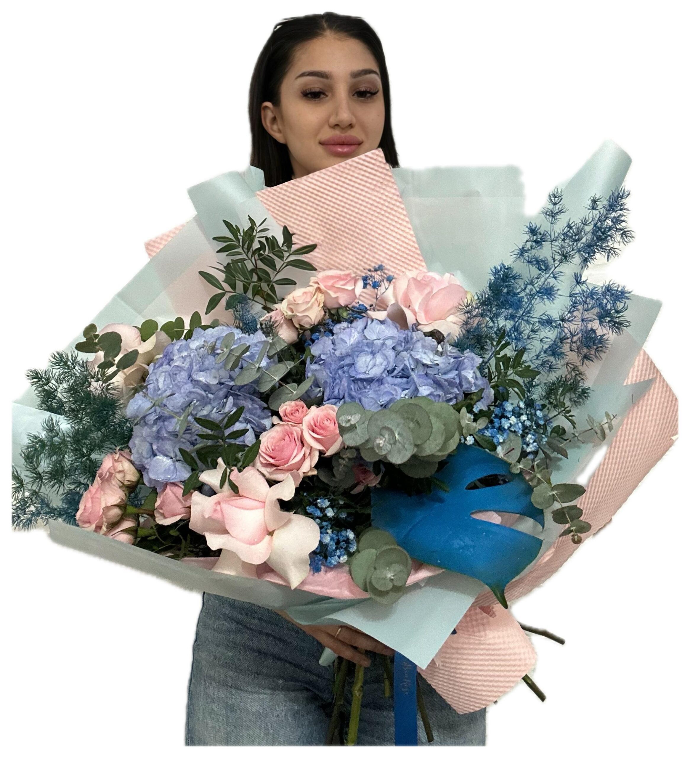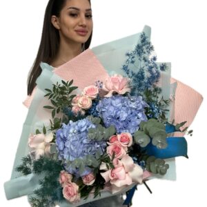 În centrul compoziției se află superba Hortensia, vedeta aranjamentului, apreciată pentru florile sale bogate și textura voluminoasă, care oferă profunzime și romantism buchetului. Nuanțele sale pastelate se îmbină perfect cu liniile grațioase ale Delphinium-ului, ale cărui tulpini înalte și elegante adaugă verticalitate și un aer sofisticat.