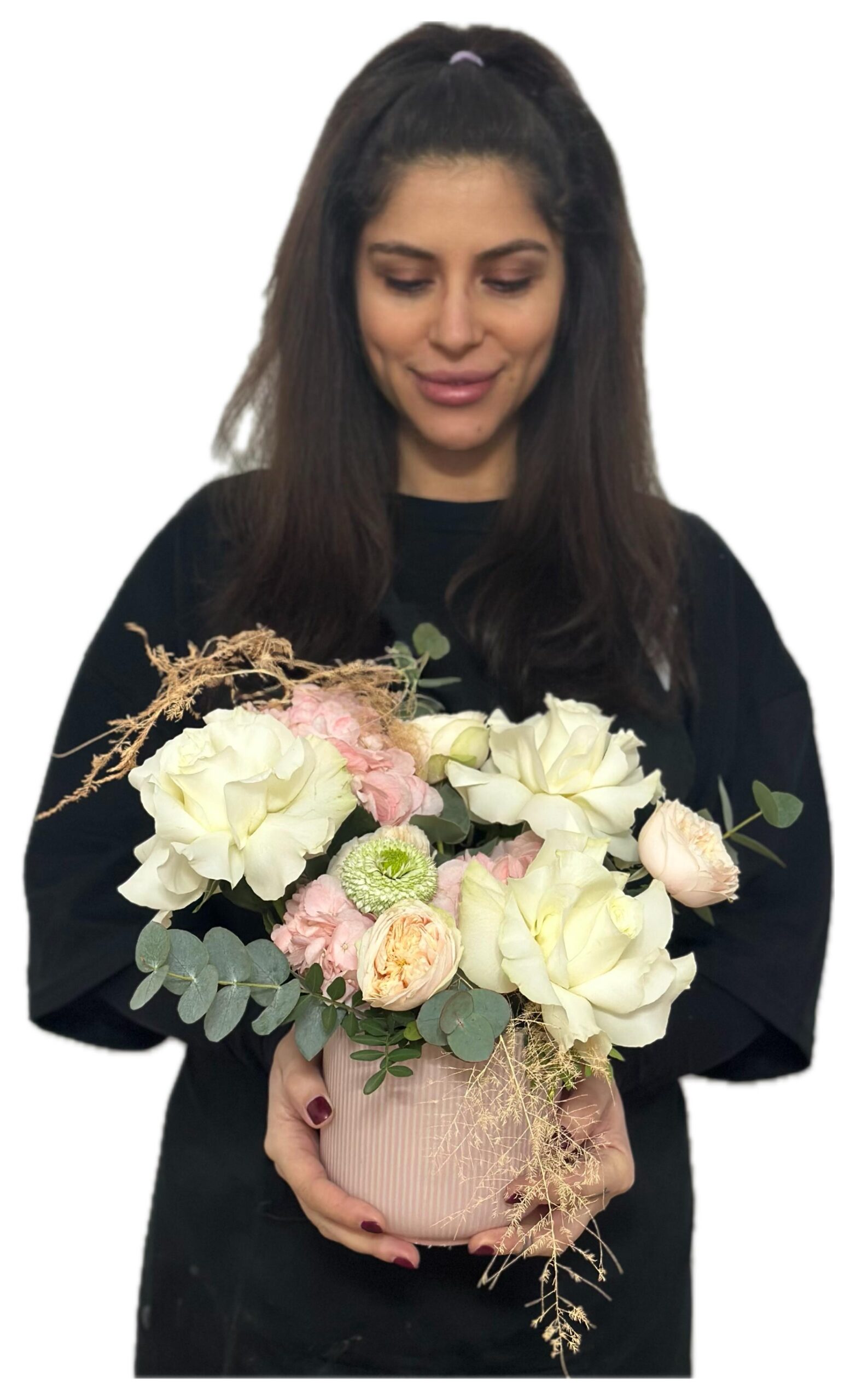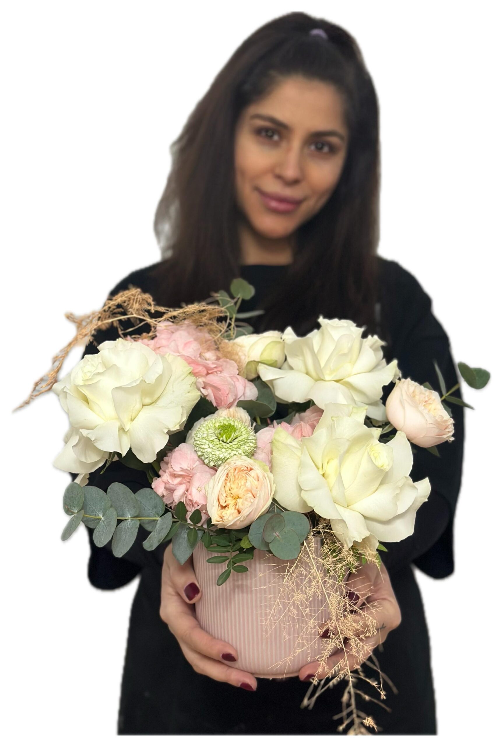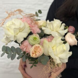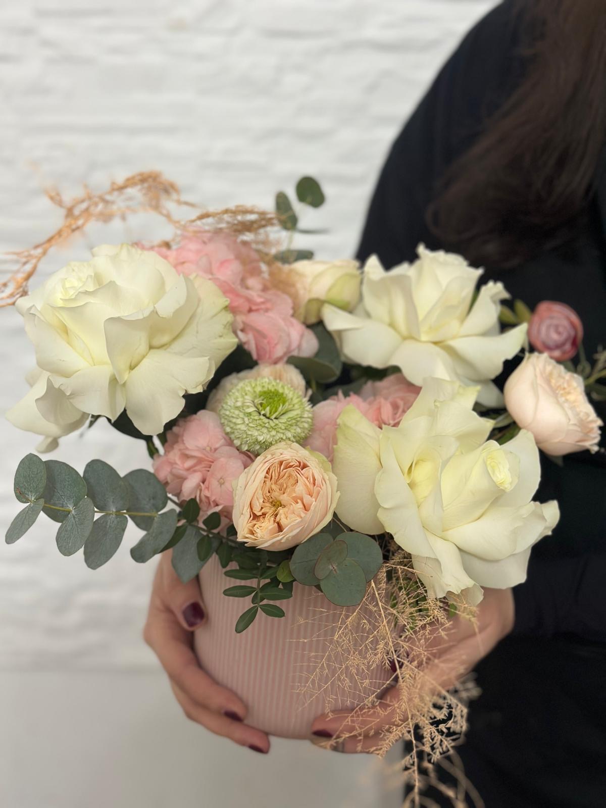 Un aranjament floral rafinat, creat pentru a impresiona prin delicatețe și armonie cromatică. Vedeta compoziției este trandafirul alb frezat, simbol al purității și eleganței, pus în valoare de hortensia roz catifelată. Accentele jucăușe de mini roze galbene adaugă un strop de prospețime și optimism, în timp ce pomponii albi completează aranjamentul cu o notă modernă și echilibrată.